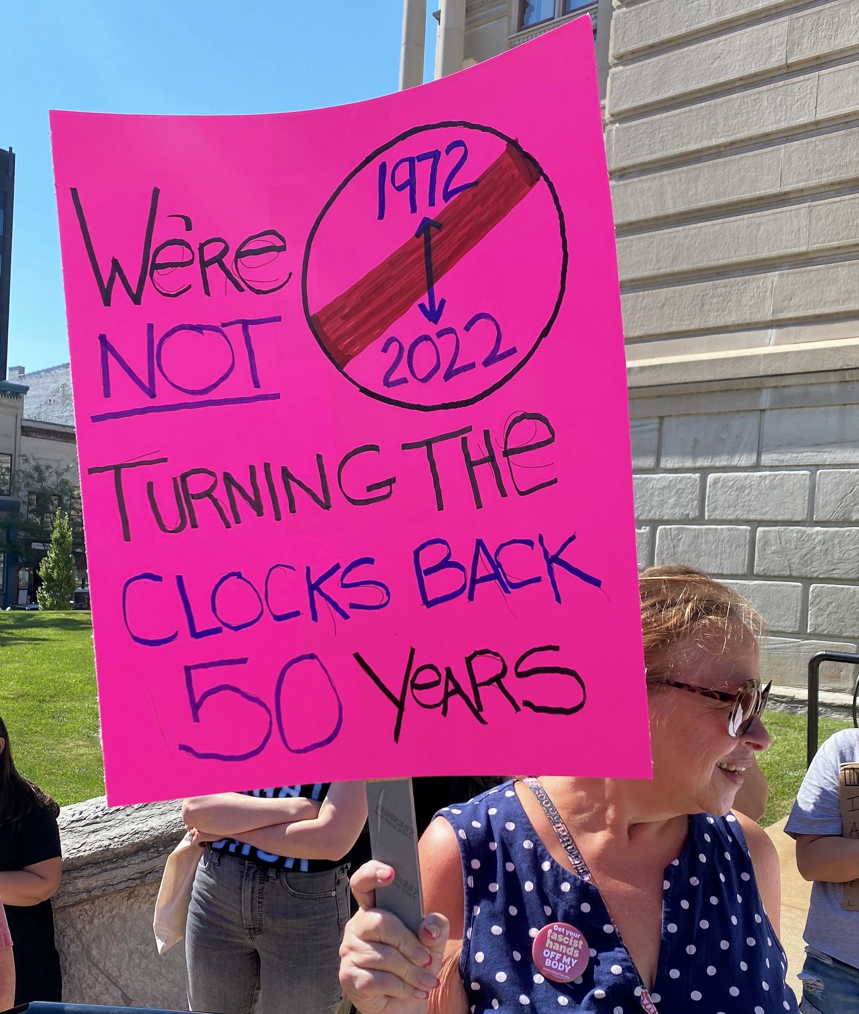 On June 29 over 300 people gathered on the Tippecanoe Courthouse steps. The crowd was filled with the young and old shouting out rallying cries with drivers honking their support as they drove by the crowd. Barb Clark and Gretchen Bertolet, two of the executive leaders of the League of Women Voters of Greater Lafayette, were there, overhearing, as they passed a group of young protesters, "it's so good to see old women here too." The attached photo is Gretchen with her sign.